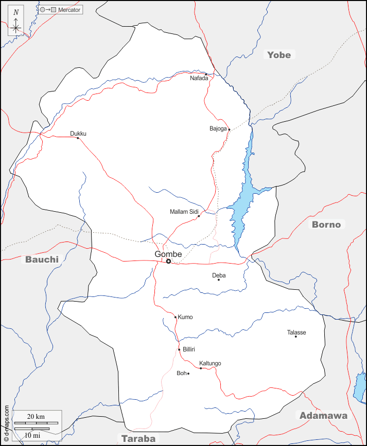 d-maps > أفريقيا > نيجيريا > ولاية غومبي > حدود, هيدروغرافيا, المدن الرئيسية, الطرق, أسماء