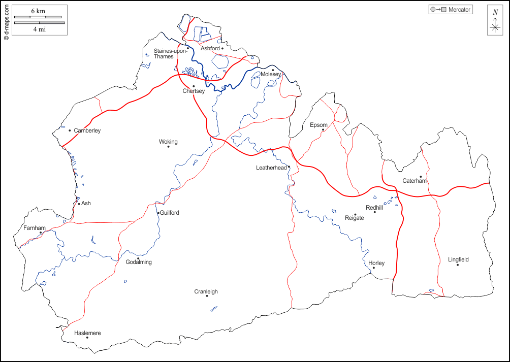 d-maps > أوروبا > المملكة المتحدة > سري > الخطوط العريضة, هيدروغرافيا, المدن الرئيسية, الطرق, أسماء, أبيض