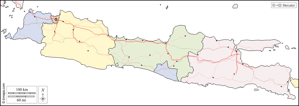 اسيا > إندونيسيا > جاوة > حدود, المحافظات, المدن الرئيسية, الطرق, اللون, أبيض