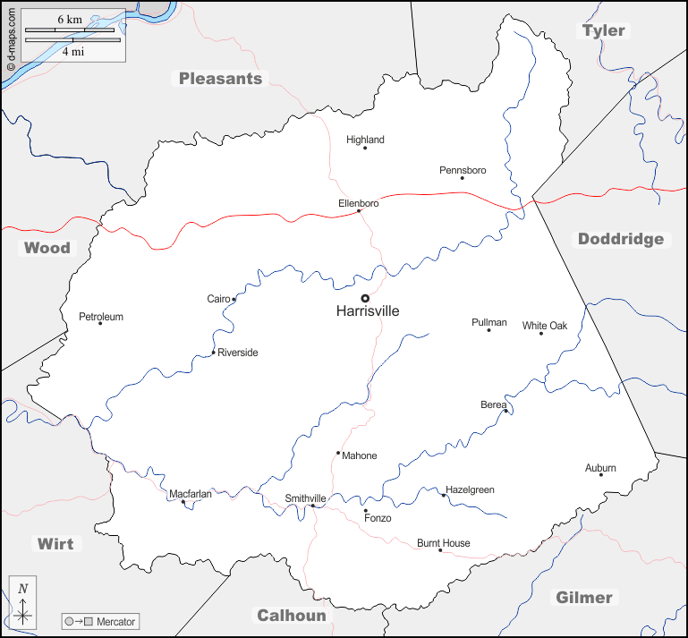 d-maps > الولايات المتحدة > فيرجينيا الغربية > مقاطعة ريتشي > حدود, هيدروغرافيا, المدن الرئيسية, الطرق, أسماء