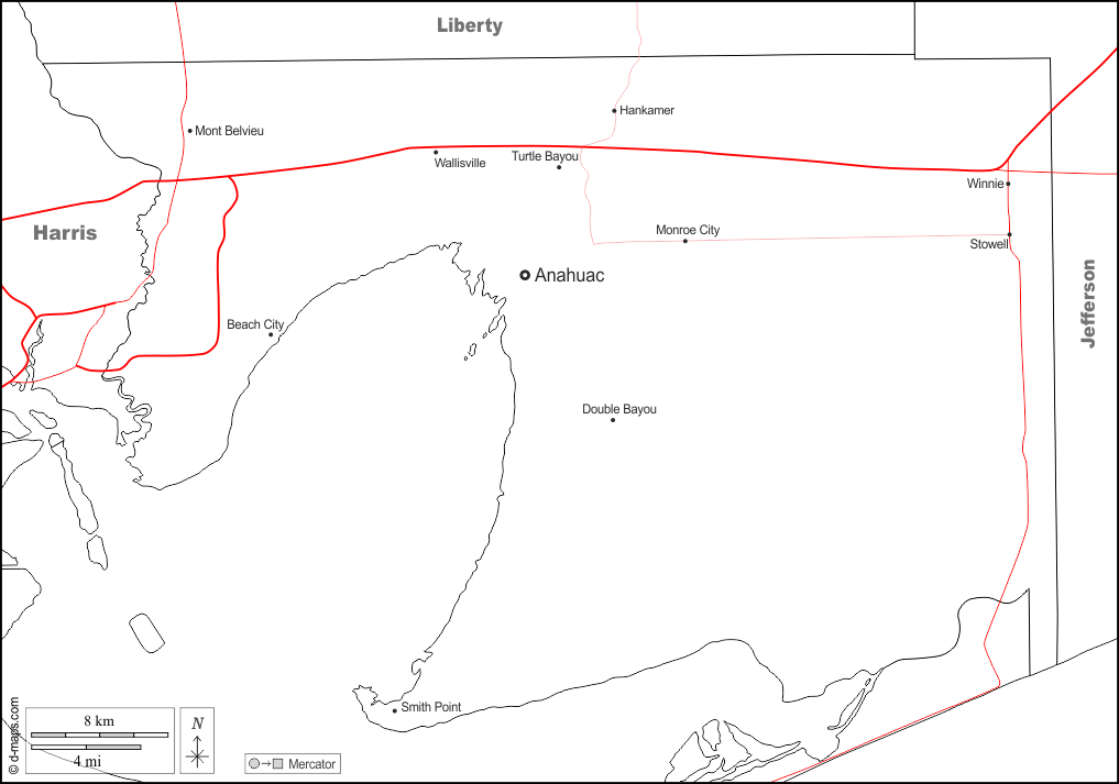 d-maps > الولايات المتحدة > تكساس > تشامبرس كونتي > حدود, المدن الرئيسية, الطرق, أسماء, أبيض