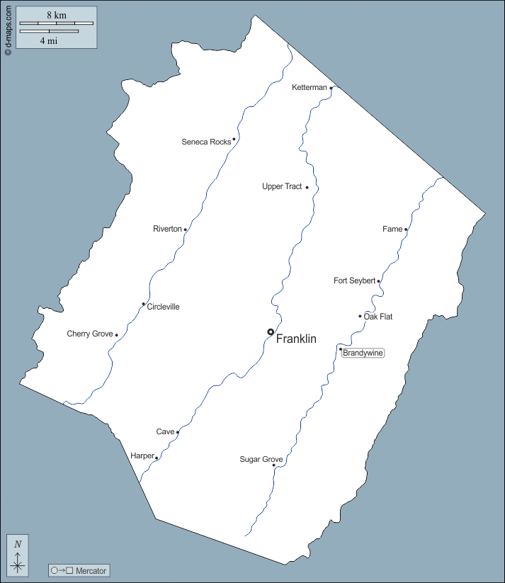 Brandywine - Cave - Cherry Grove - Circleville - Fame - Fort Seybert - Franklin - Harper - Ketterman - Oak Flat - Riverton - Seneca Rocks - Sugar Grove - Upper Tract