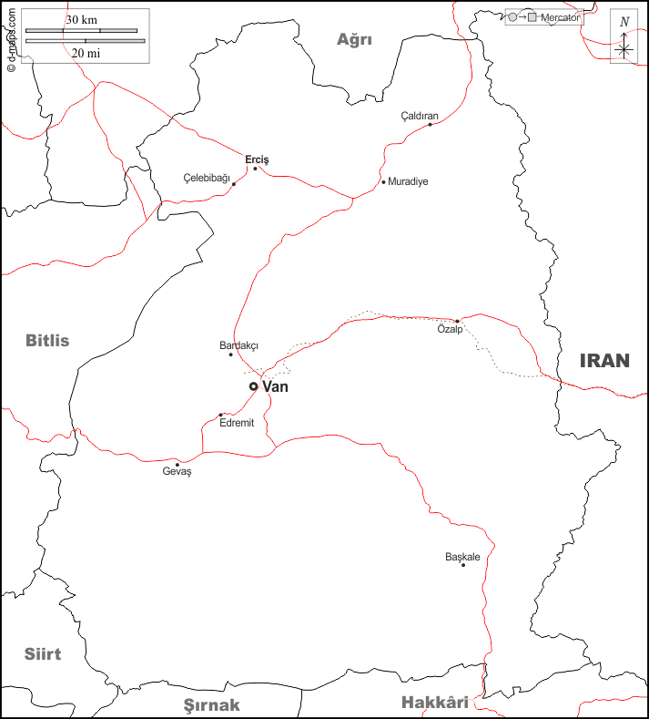 d-maps > اسيا > تركيا > وان > حدود, المدن الرئيسية, الطرق, أسماء, أبيض