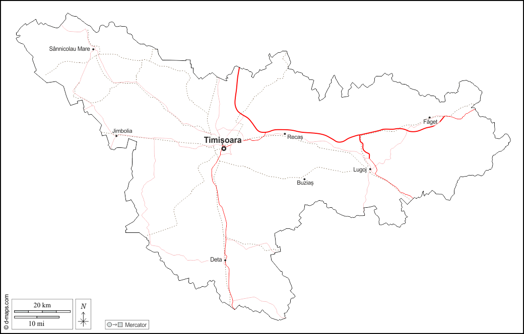 d-maps > أوروبا > رومانيا > مقاطعة تيميتش > الخطوط العريضة, المدن الرئيسية, الطرق, أسماء, أبيض
