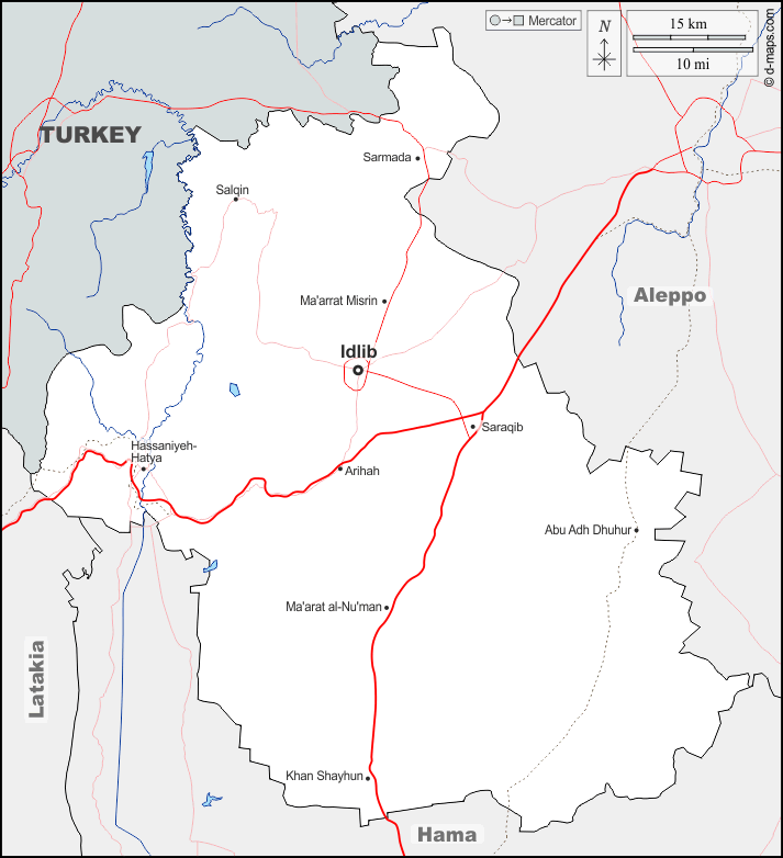 d-maps > اسيا > سوريا > مُحافظة ادلب > حدود, هيدروغرافيا, المدن الرئيسية, الطرق, أسماء
