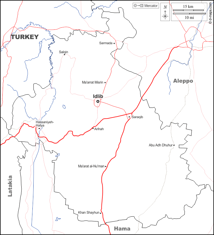 d-maps > اسيا > سوريا > مُحافظة ادلب > حدود, هيدروغرافيا, المدن الرئيسية, الطرق, أسماء, أبيض