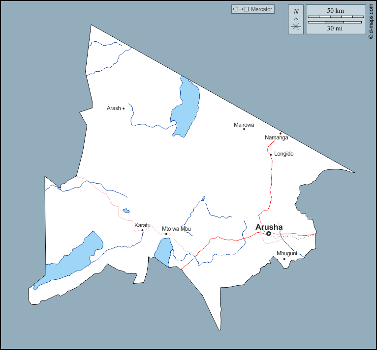 d-maps > أفريقيا > تنزانيا > أروشا > الخطوط العريضة, هيدروغرافيا, المدن الرئيسية, الطرق, أسماء