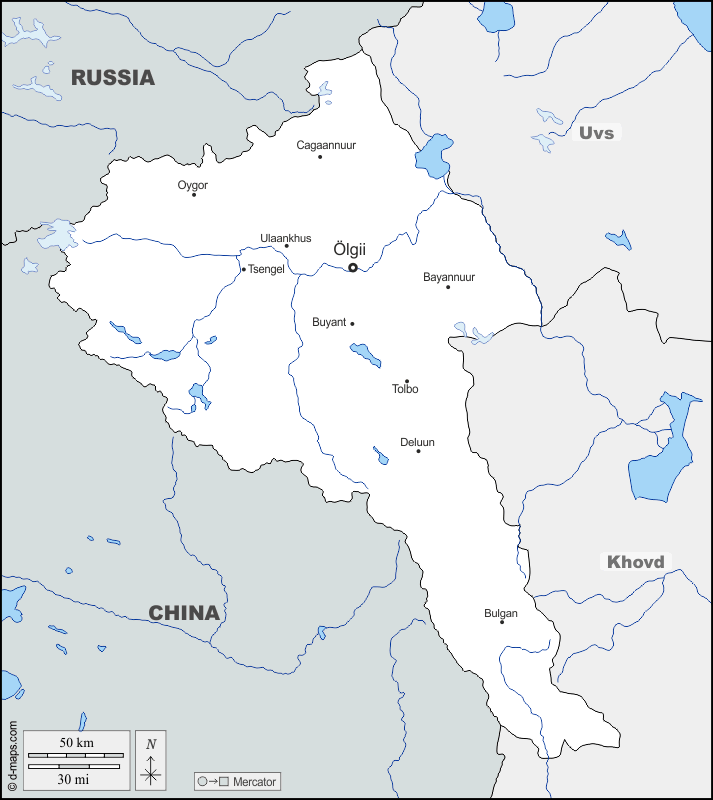 d-maps > اسيا > منغوليا > محافظة بايان-أولجي > حدود, هيدروغرافيا, المدن الرئيسية, أسماء