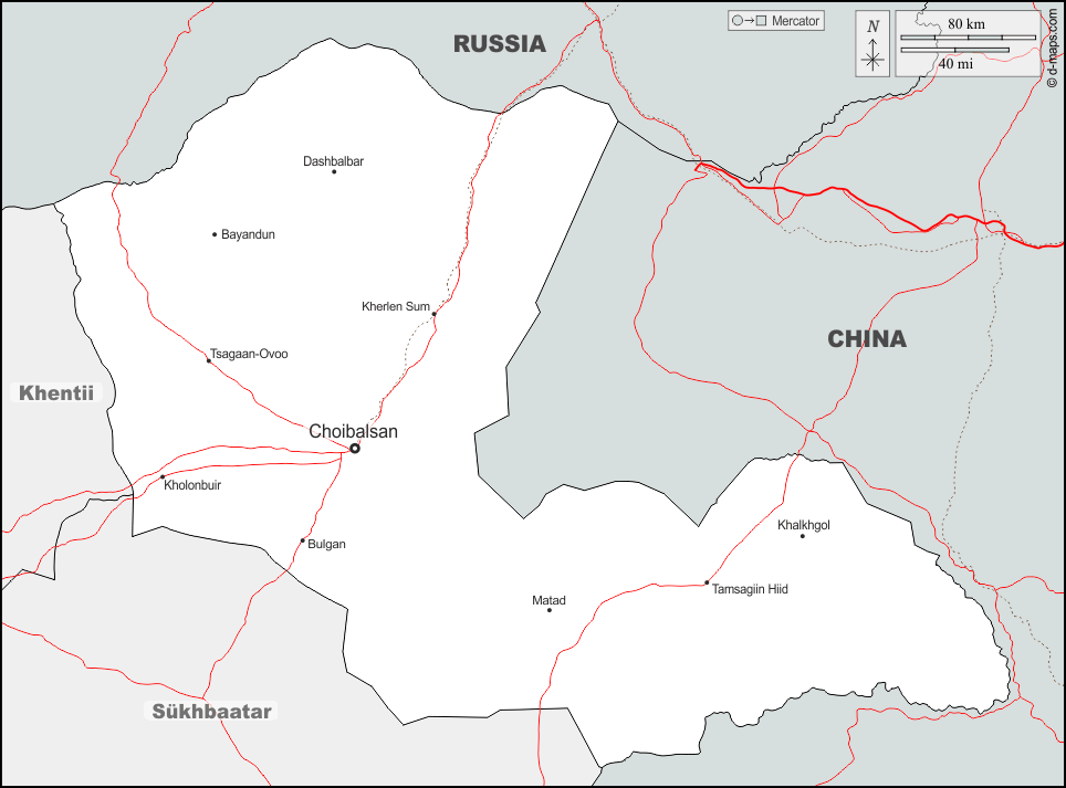Bayandun - Bulgan - Choibalsan - Dashbalbar - Khalkhgol - Kherlen Sum - Kholonbuir - Matad - Tamsagiin Hiid - Tsagaan-Ovoo