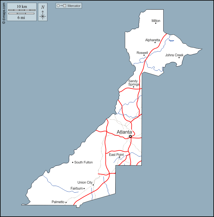 d-maps > الولايات المتحدة > جورجيا > مقاطعة فولتون > الخطوط العريضة, هيدروغرافيا, المدن الرئيسية, الطرق, أسماء