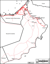 Adam - Al Khaboura - As Sib - As Suwayq - Bahla - Bani Bu Ali - Bawshar - Buraimi - Ibra - Ibri - Khasab - Masqat - Nizwa - Rustaq - Salalah - Shinas - Suhar - Sur - Wadi Say
