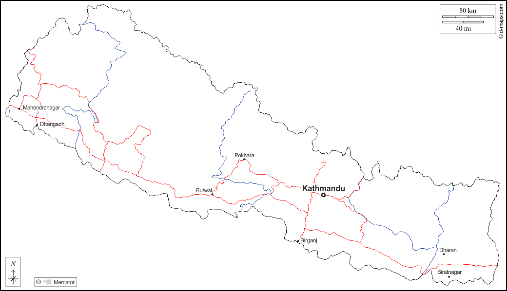 Asien > Nepal > Umrisse, Hydrografie, Wichtige Städte, Straßen, Namen, weiß