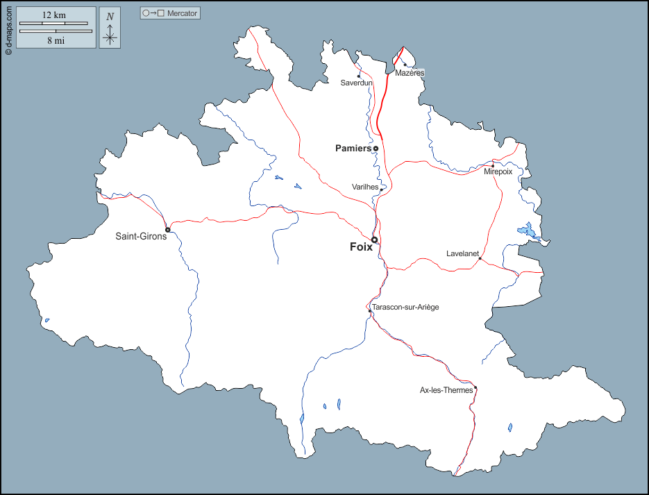 d-maps > Europa > Frankreich > Ariège > Umrisse, Hydrografie, Wichtige Städte, Straßen, Namen
