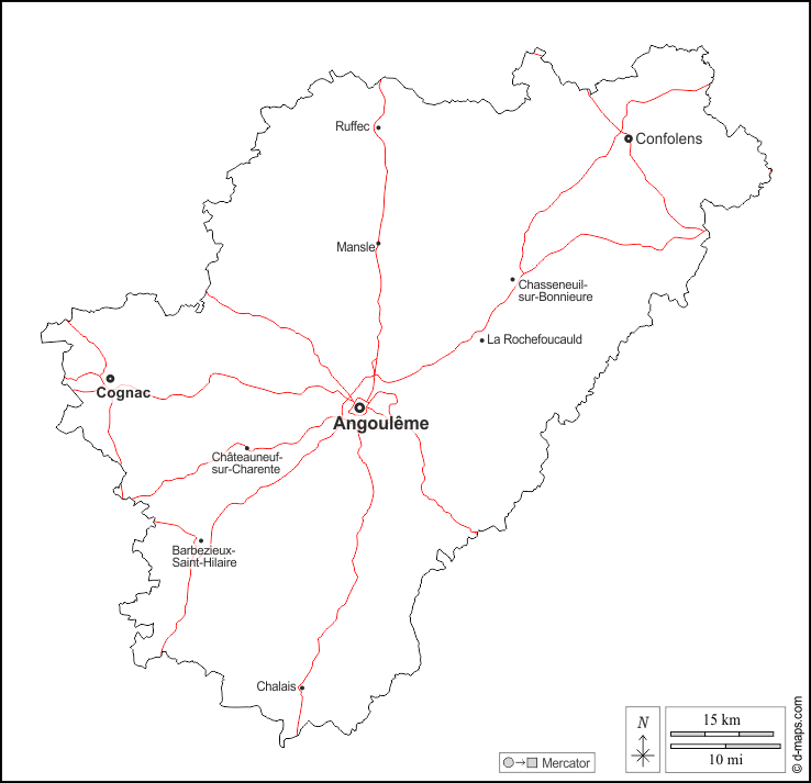 d-maps > Europa > Frankreich > Charente > Umrisse, Wichtige Städte, Straßen, Namen, weiß