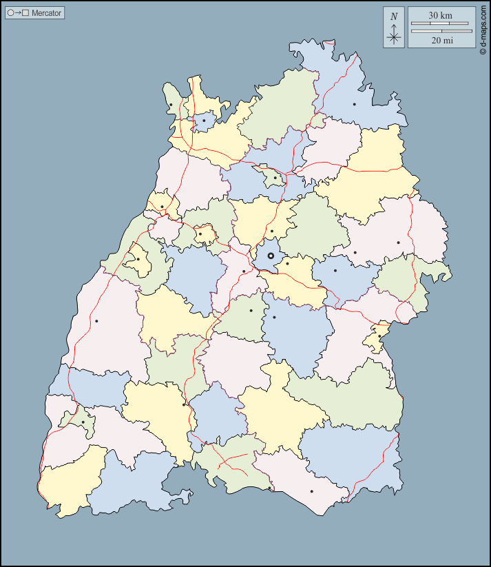 d-maps > Europa > Deutschland > Land Baden-Württemberg > Umrisse, Bezirke, Wichtige Städte, Straßen, Farbe