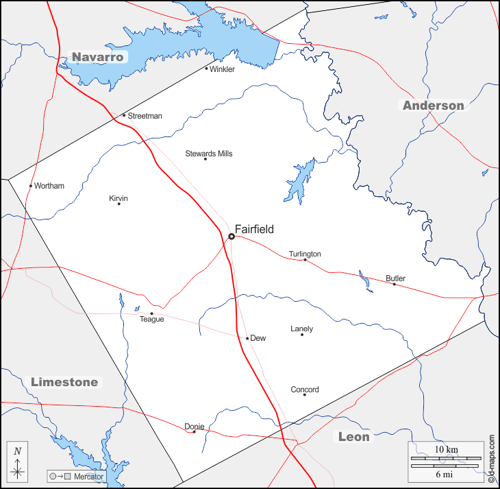 d-maps > Vereinigte Staaten von Amerika (USA) > Texas > Freestone County > Grenzen, Hydrografie, Wichtige Städte, Straßen, Namen