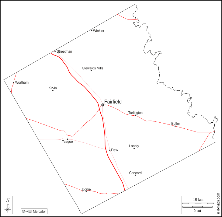 d-maps > Vereinigte Staaten von Amerika (USA) > Texas > Freestone County > Umrisse, Wichtige Städte, Straßen, Namen, weiß