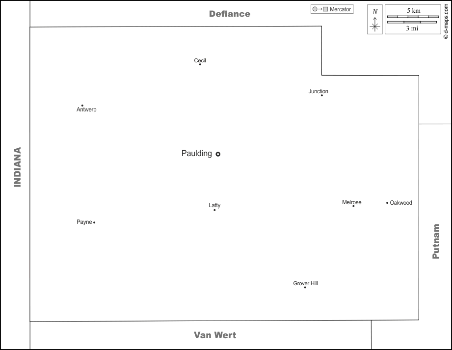 d-maps > Vereinigte Staaten von Amerika (USA) > Ohio > Paulding County > Grenzen, Wichtige Städte, Namen, weiß