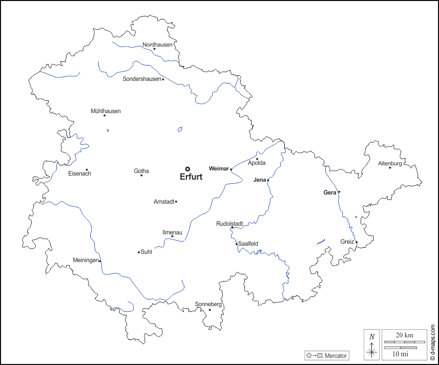 Europa > Deutschland > Freistaat Thüringen > Umrisse, Hydrografie, Wichtige Städte, Namen, weiß
