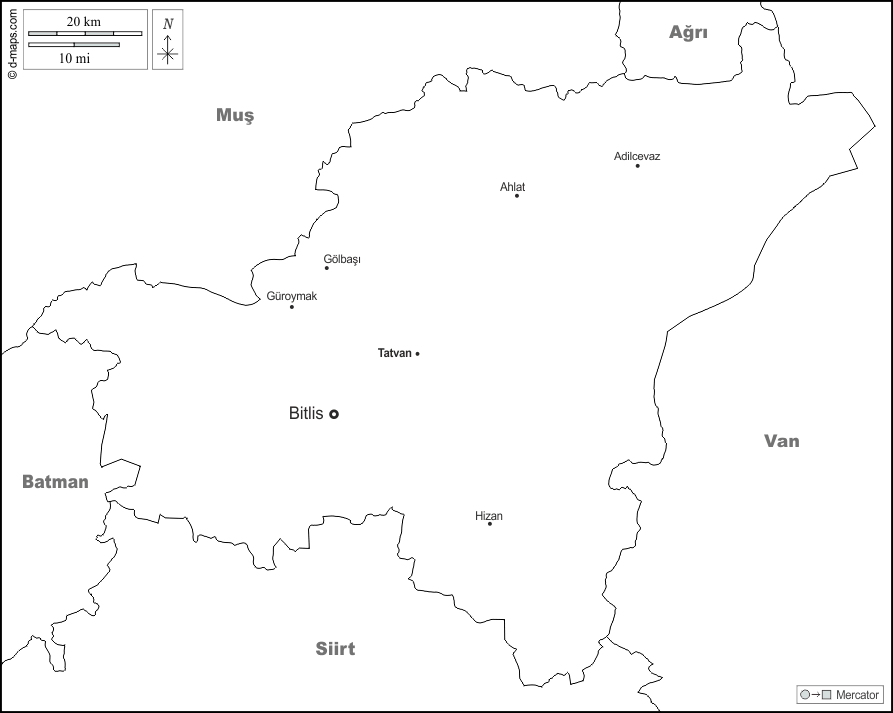 d-maps > Asien > Türkei > Bitlis > Grenzen, Wichtige Städte, Namen, weiß