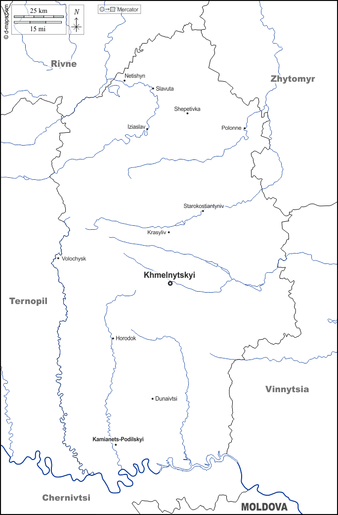 d-maps > Europa > Ukraine > Chmelnyzkyj > Grenzen, Hydrografie, Wichtige Städte, Namen, weiß