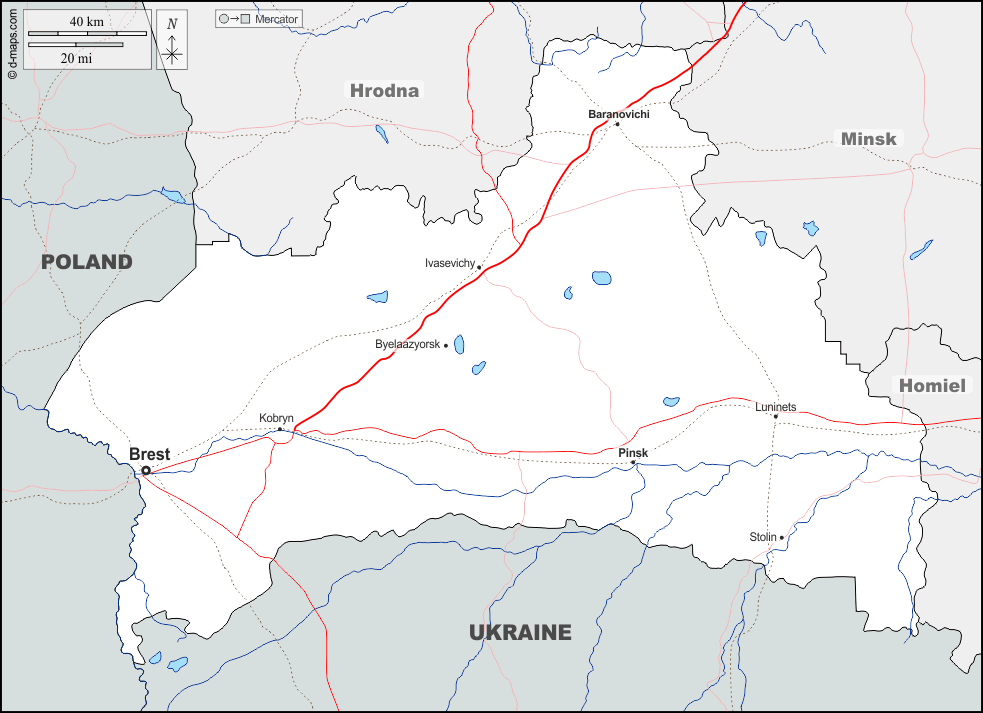 d-maps > Europa > Weißrussland (Belarus) > Breszkaja Woblasz > Grenzen, Hydrografie, Wichtige Städte, Straßen, Namen