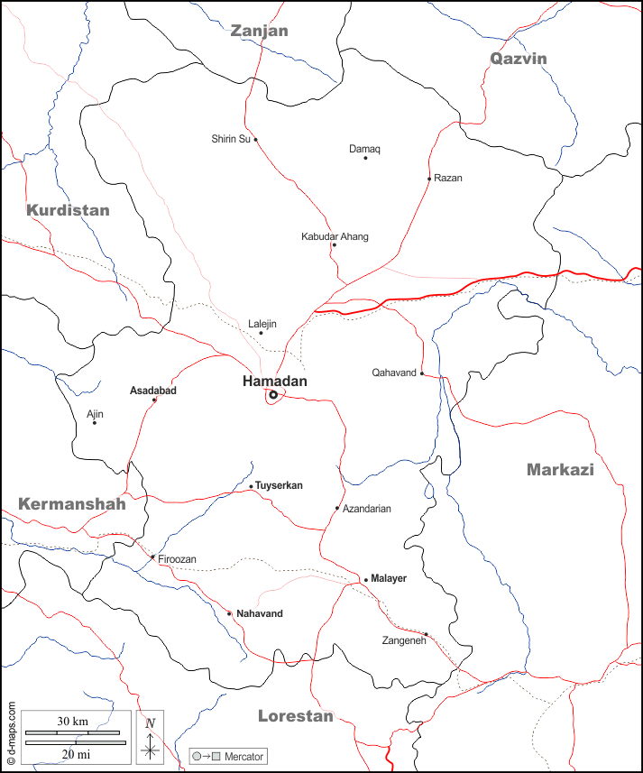 d-maps > Asien > Iran > Hamadan > Grenzen, Hydrografie, Wichtige Städte, Straßen, Namen, weiß