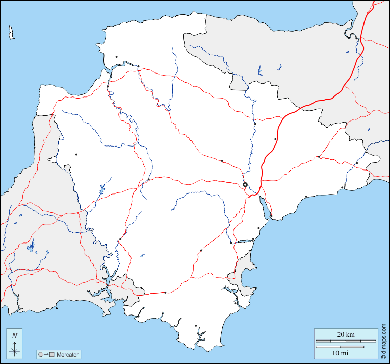 d-maps > Europa > Vereinigtes Königreich > Devon > Grenzen, Hydrografie, Wichtige Städte, Straßen