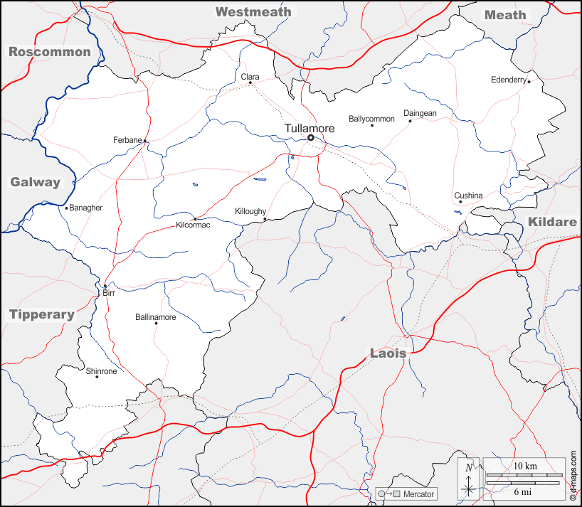 Europa > Irland > Offaly > Grenzen, Hydrografie, Wichtige Städte, Straßen, Namen