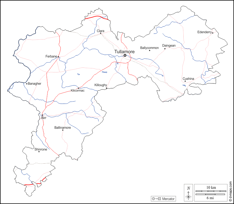 Europa > Irland > Offaly > Umrisse, Hydrografie, Wichtige Städte, Straßen, Namen, weiß
