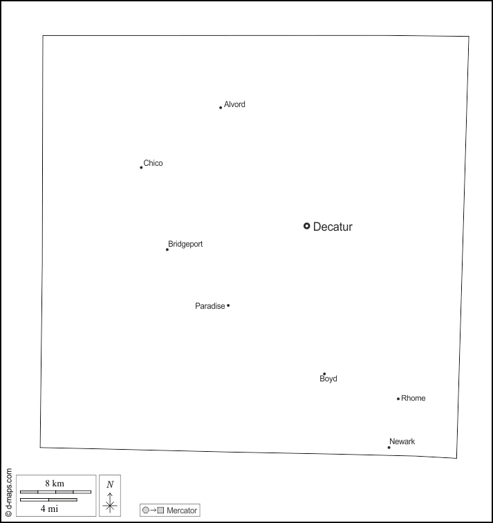 d-maps > United States of America (USA) > Texas > Wise County > outline, main cities, names, white