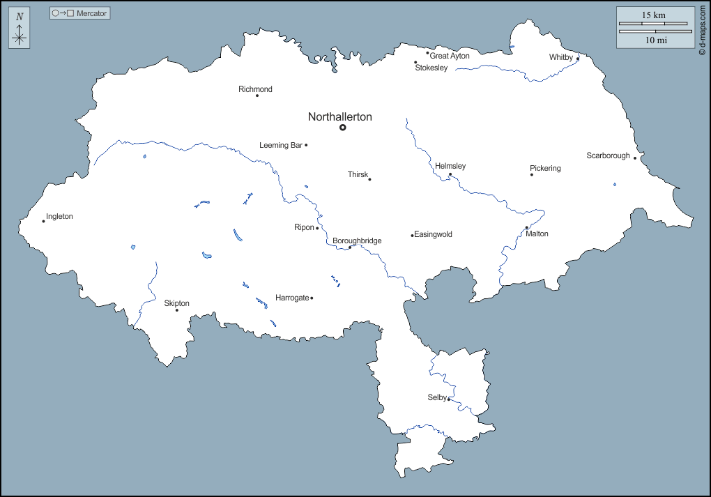 d-maps > Europe > United Kingdom > North Yorkshire > outline, hydrography, main cities, names
