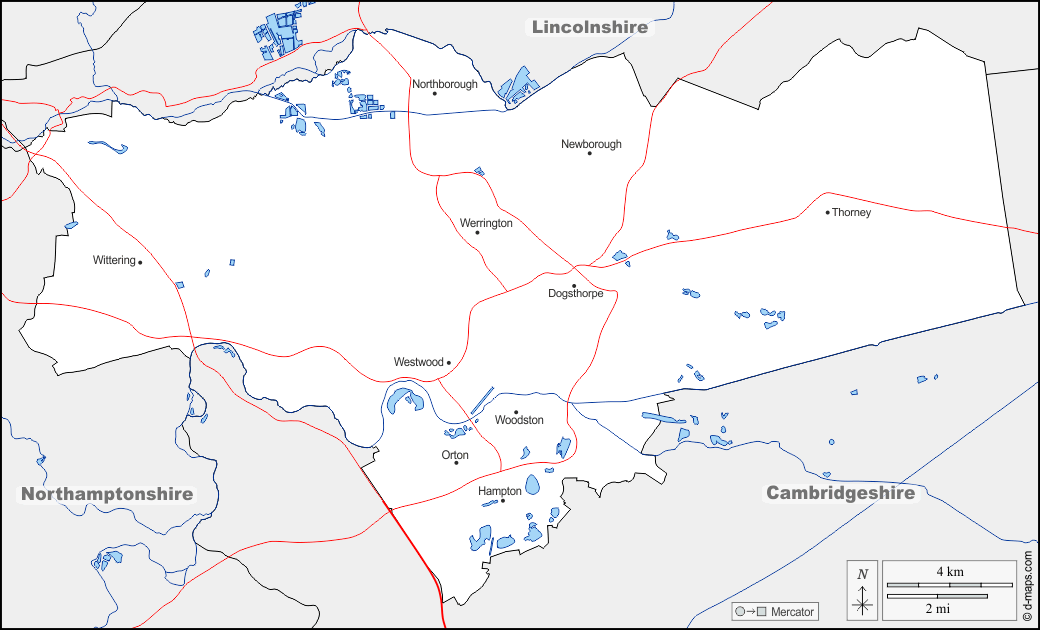 d-maps > Europe > United Kingdom > Peterborough > boundaries, hydrography, neighborhoods, roads, names