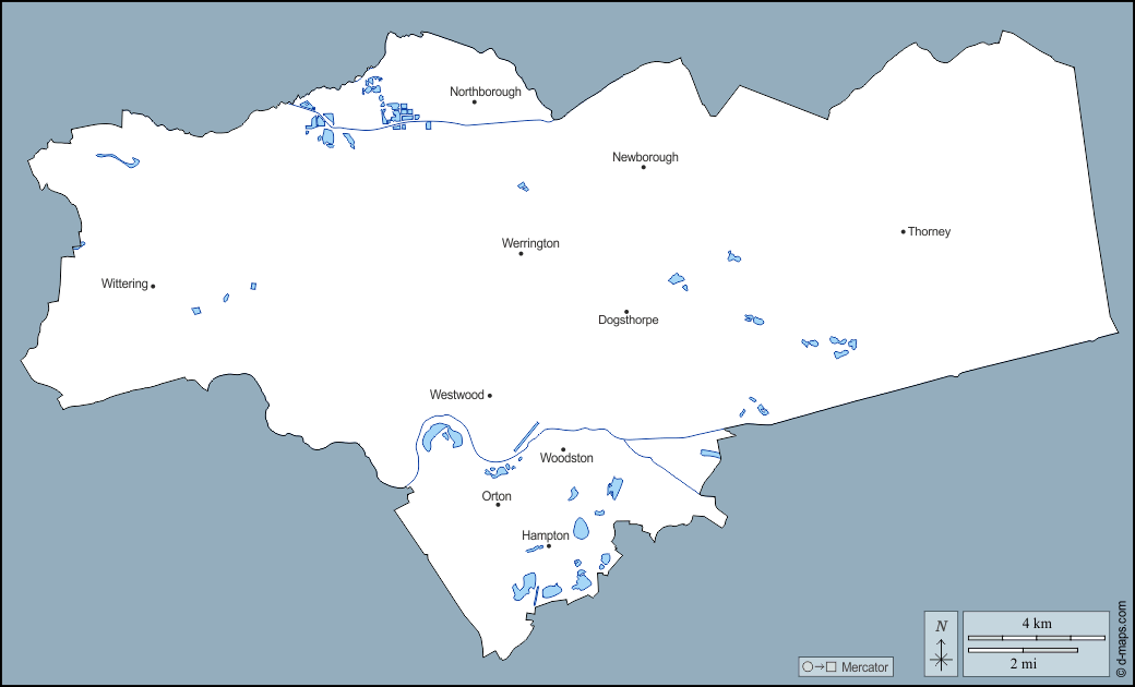 d-maps > Europe > United Kingdom > Peterborough > outline, hydrography, neighborhoods, names