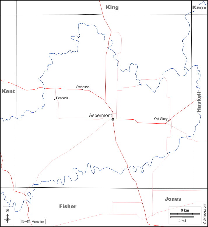 d-maps > United States of America (USA) > Texas > Stonewall County > boundaries, hydrography, main cities, roads, names, white