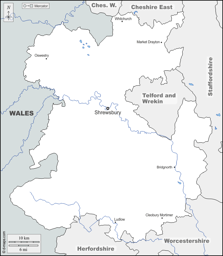 d-maps > Europe > United Kingdom > Shropshire > boundaries, hydrography, main cities, names