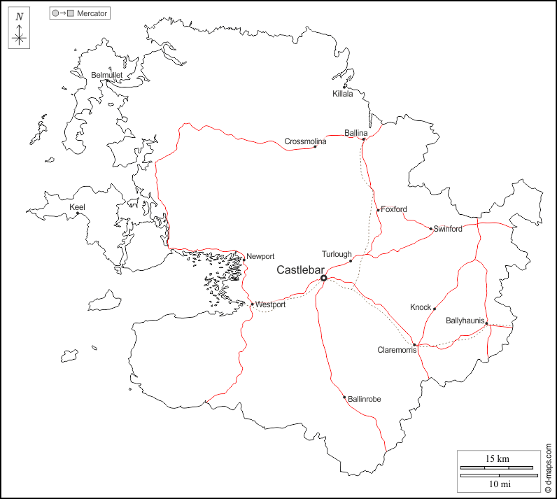 d-maps > Europe > Ireland > Mayo > outline, main cities, roads, names, white