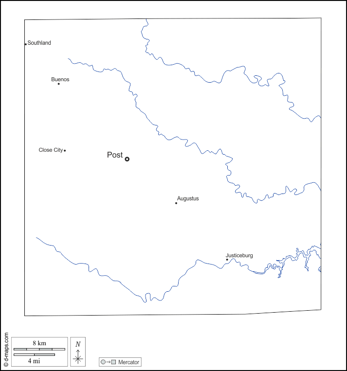 d-maps > United States of America (USA) > Texas > Garza County > outline, hydrography, main cities, names, white