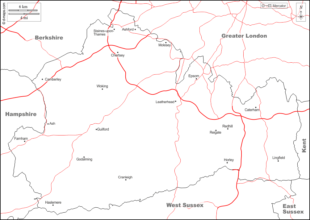 d-maps > Europe > United Kingdom > Surrey > boundaries, main cities, roads, names, white