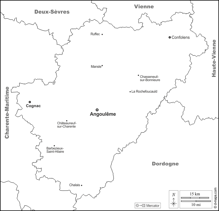 d-maps > Europe > France > Charente > boundaries, main cities, names, white