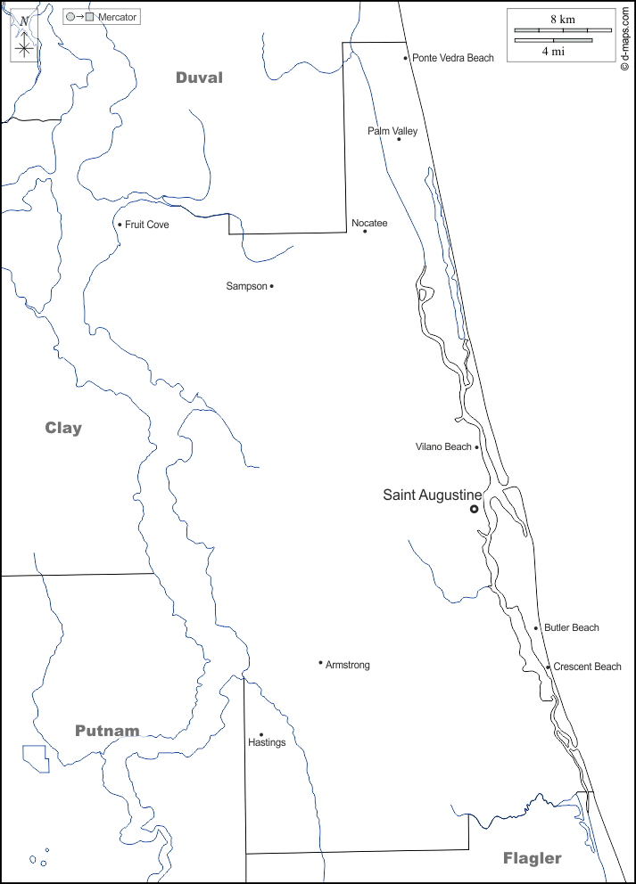 d-maps > United States of America (USA) > Florida > Saint Johns County > boundaries, hydrography, main cities, names, white
