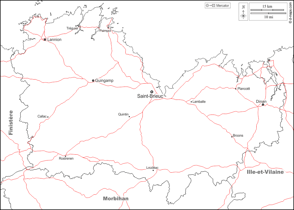 d-maps > Europe > France > Côtes-d'Armor > boundaries, main cities, roads, names, white