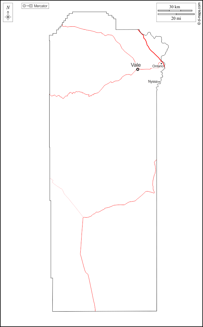 d-maps > United States of America (USA) > Oregon > Malheur County > outline, main cities, roads, names, white