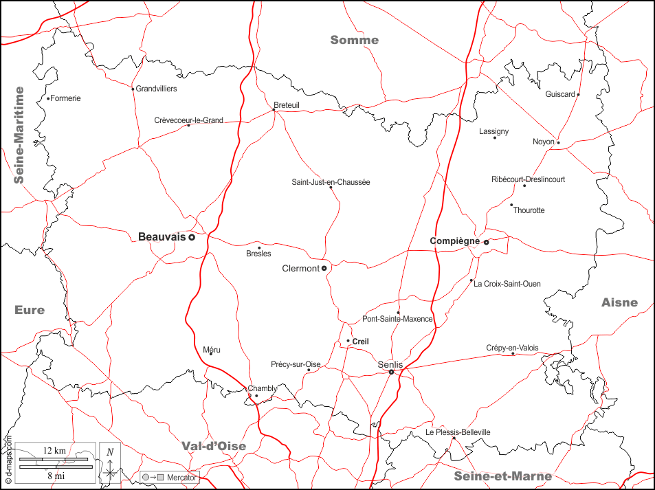 d-maps > Europe > France > Oise > boundaries, main cities, roads, names, white