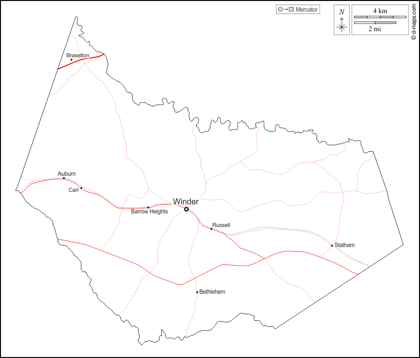 d-maps > United States of America (USA) > Georgia > Barrow County > outline, main cities, roads, names, white