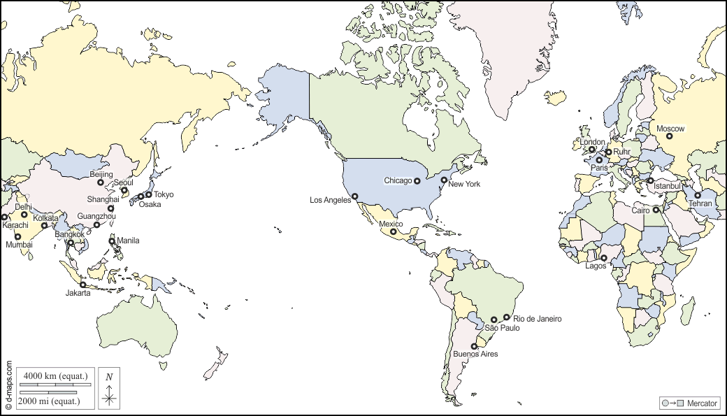 Bangkok - Beijing - Buenos Aires - Cairo - Chicago - Delhi - Guangzhou - Istanbul - Jakarta - Karachi - Kolkata - Lagos - London - Los Angeles - Manila - Mexico - Moscow - Mumbai - New York - Osaka - Paris - Rio de Janeiro - Ruhr - Seoul - Shanghai - São Paulo - Tehran - Tokyo