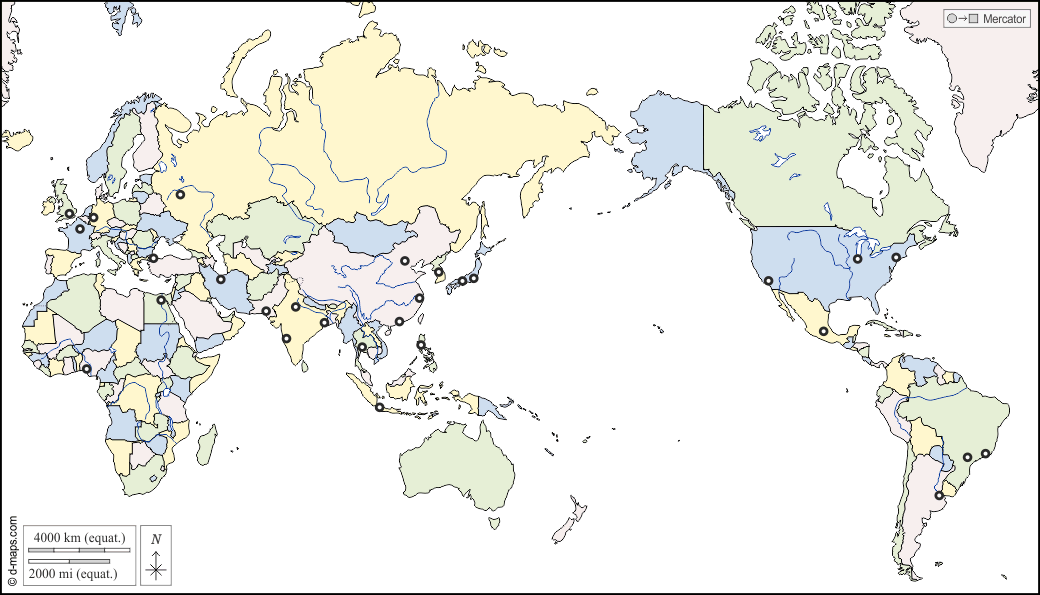 Bangkok - Beijing - Buenos Aires - Cairo - Chicago - Delhi - Guangzhou - Istanbul - Jakarta - Karachi - Kolkata - Lagos - London - Los Angeles - Manila - Mexico - Moscow - Mumbai - New York - Osaka - Paris - Rio de Janeiro - Ruhr - Seoul - Shanghai - São Paulo - Tehran - Tokyo