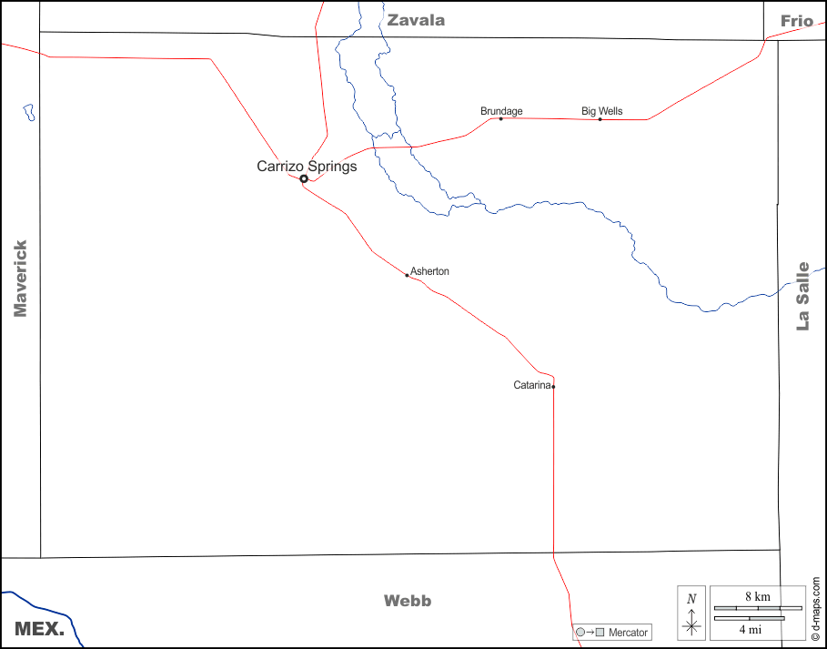 d-maps > United States of America (USA) > Texas > Dimmit County > boundaries, hydrography, main cities, roads, names, white