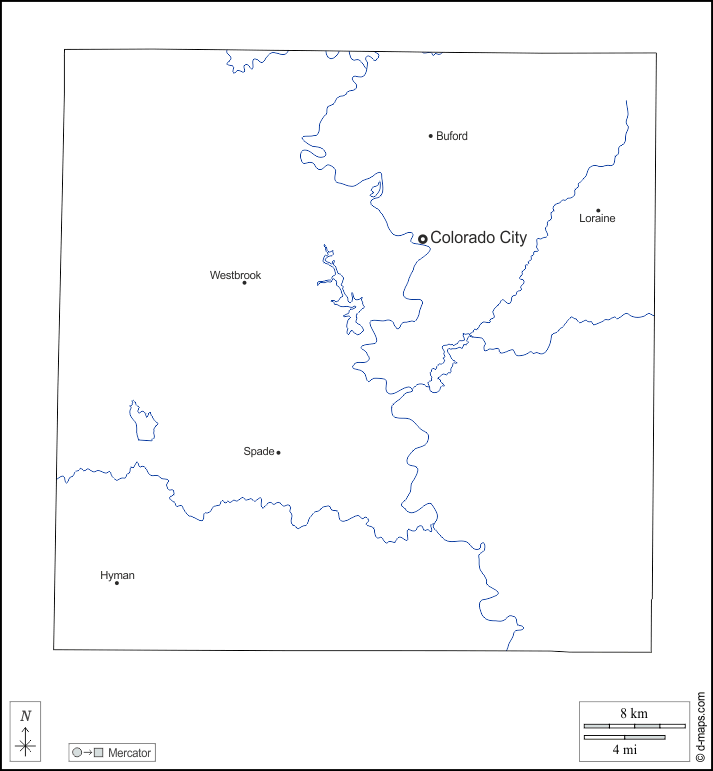 d-maps > United States of America (USA) > Texas > Mitchell County > outline, hydrography, main cities, names, white