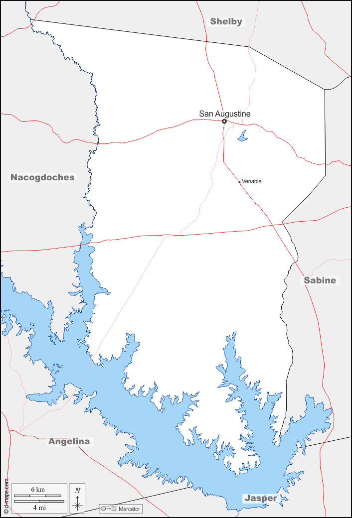 d-maps > United States of America (USA) > Texas > San Augustine County > boundaries, hydrography, main cities, roads, names